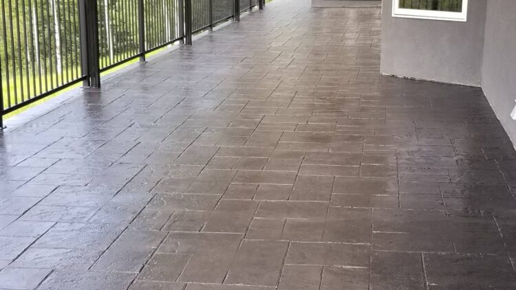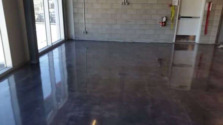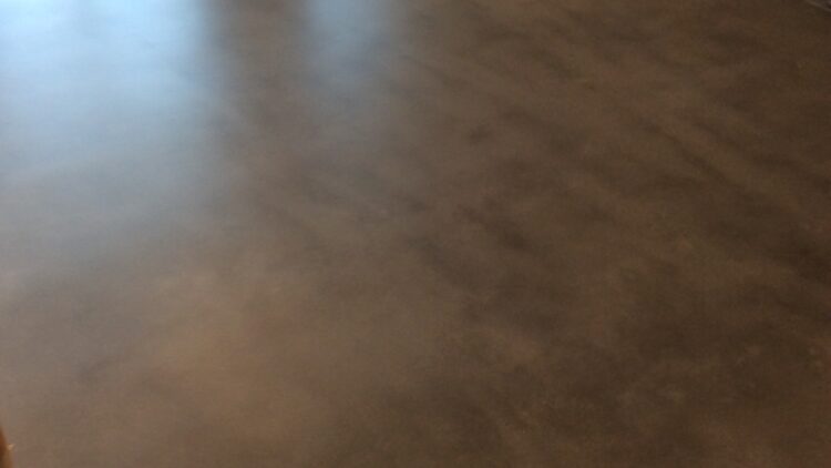 After preparing the surface, we apply a bonding agent and a self-leveling compound. That is a thick compound that spreads over the concrete surface and cures to create a smooth and even surface.